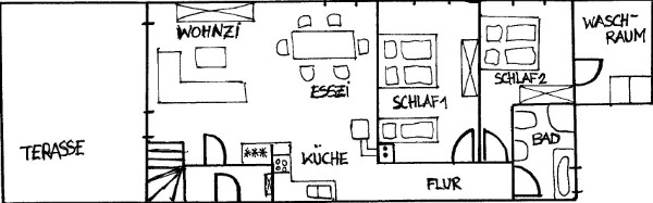 Unsere Ferienwohnung "Dorfglück" ist 100qm groß und besteht aus 2 Schlafzimmern (mit Betten für bis zu 6 Personen und 2 Kinderbettchen), großem Wohn-/Ess-/Küchenbereich, einem Bad, Flur und Windfang/Garderobe. Es ist eine Nichtraucherwohnung.